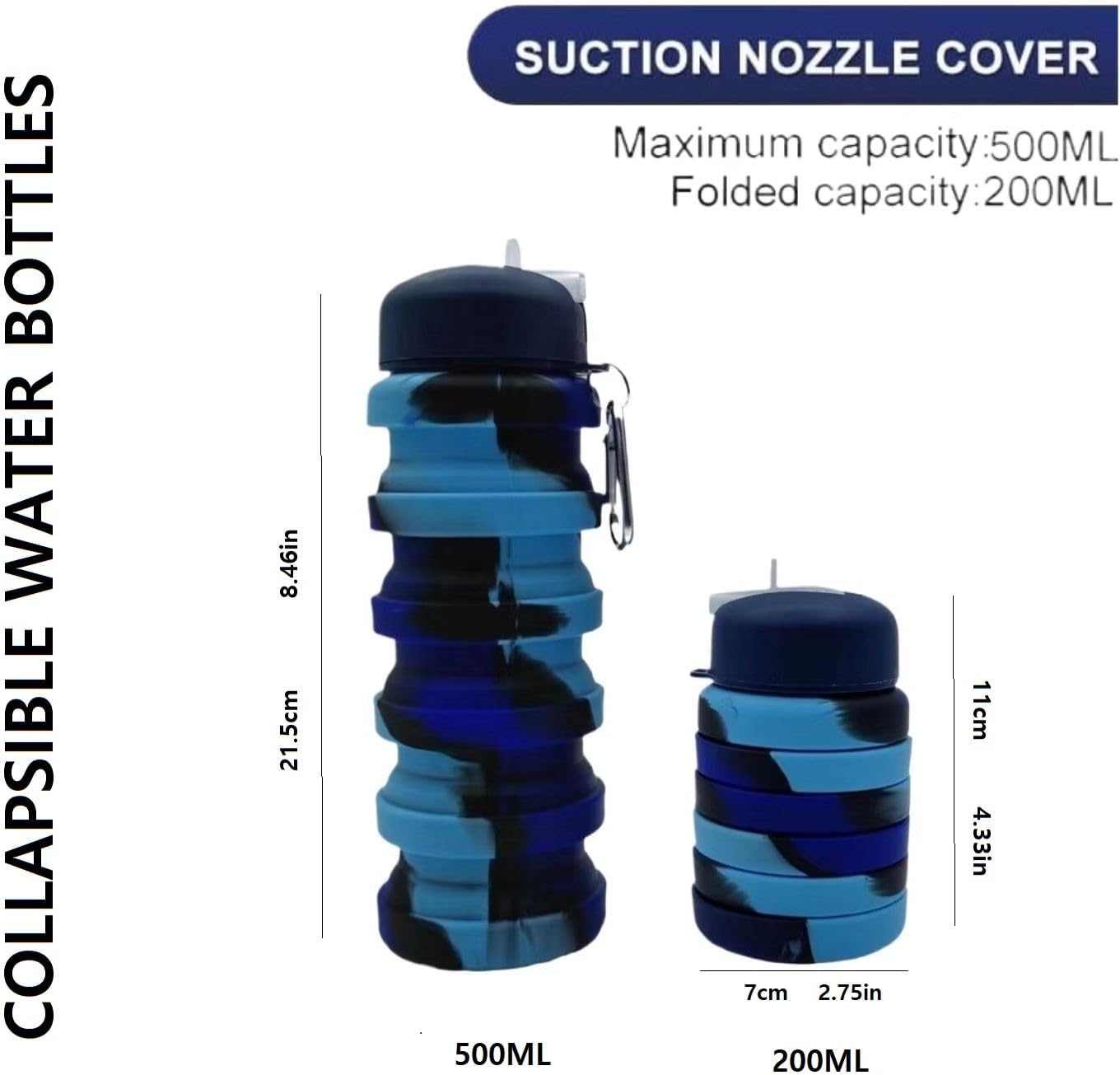 Collapsible Water Bottles 2 Pack 16oz(about 500ml), Travel Portable Sport Water Bottle, Silicone Foldable Water Bottles for Gym Camping Outdoor Hiking. (Black+Blue)